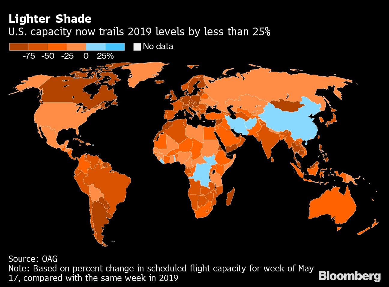 Overall, air travel ticked up in the most recent week. Global capacity rose by one point to 58% of pre-crisis levels, based on Bloomberg’s weekly flight tracker, which uses OAG data to monitor the pulse of the comeback.