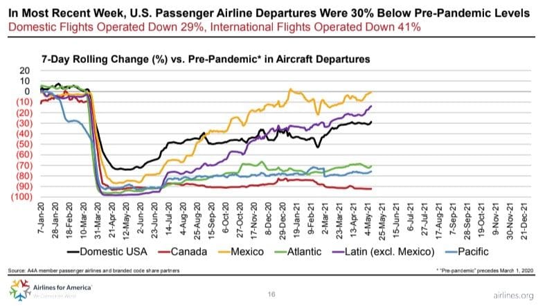 Overall, U.S. capacity is now down less than 25% from the same week in 2019, jumping more than 7 percentage points in the past month, with the big three of American Airlines Group Inc., Delta Air Lines Inc. and United Airlines Holdings Inc., along with discount specialist Southwest Airlines Co. and others accelerating their expansions.