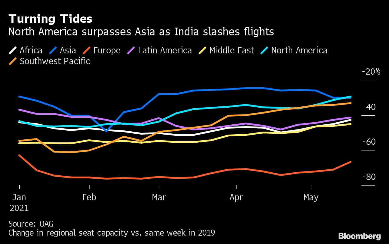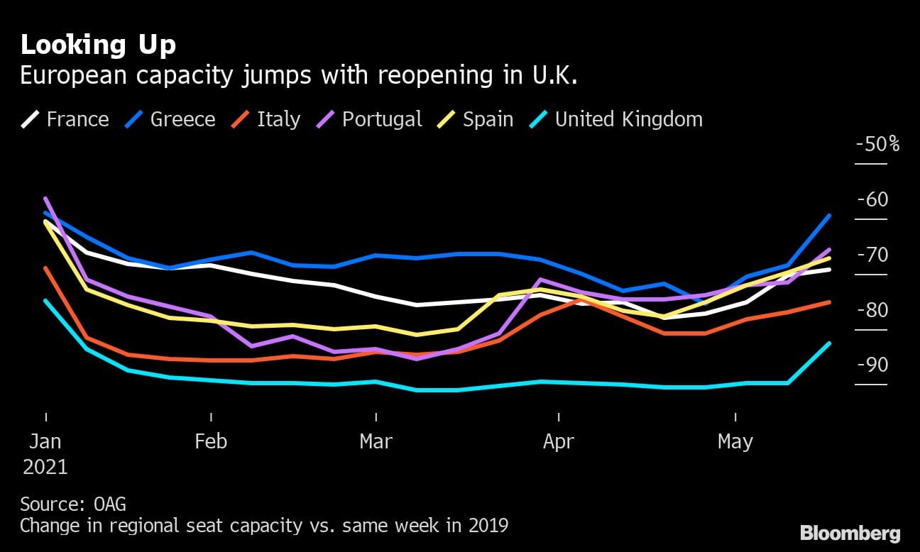 Greece, Italy and France have also made strides, with EU vaccine rates accelerating and plans being rolled out to welcome more outside visitors. In all, airline capacity closed the gap with 2019 levels by 4.4 percentage points in the past week, the most of any region.