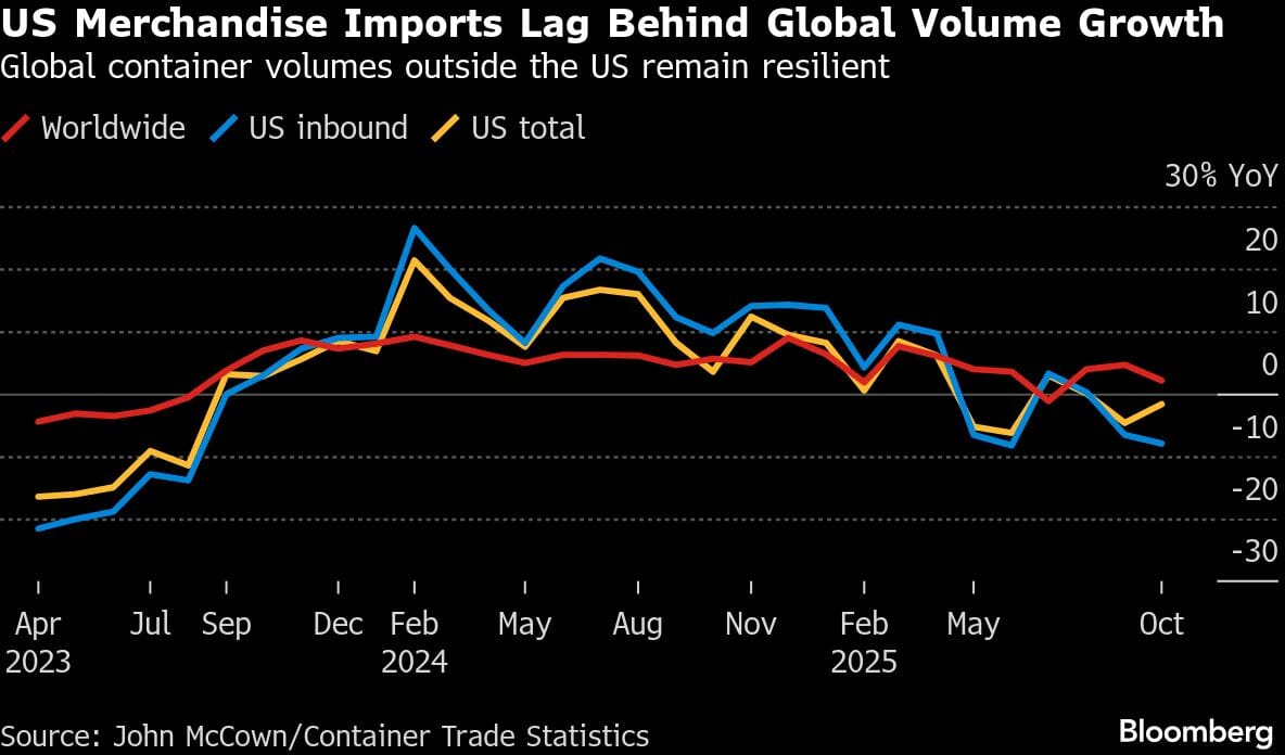 Merchandise trade across the world held up relatively well through 2025, even as US President Donald Trump started erecting a tariff wall around the world’s largest economy. Data cited this week by shipping industry veteran John McCown show global container volumes grew 2.1% in October from a year earlier.