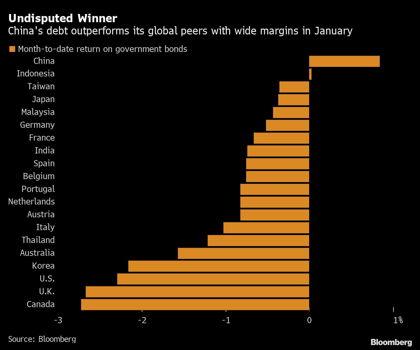 “From a dollar-based investor perspective, only Chinese bonds have been a winner for the best part of the last 18 months,” said Steven Major, head of fixed-income research at HSBC Holding Plc. “I think investors like to back winners, so that trends looks to continue for us.”