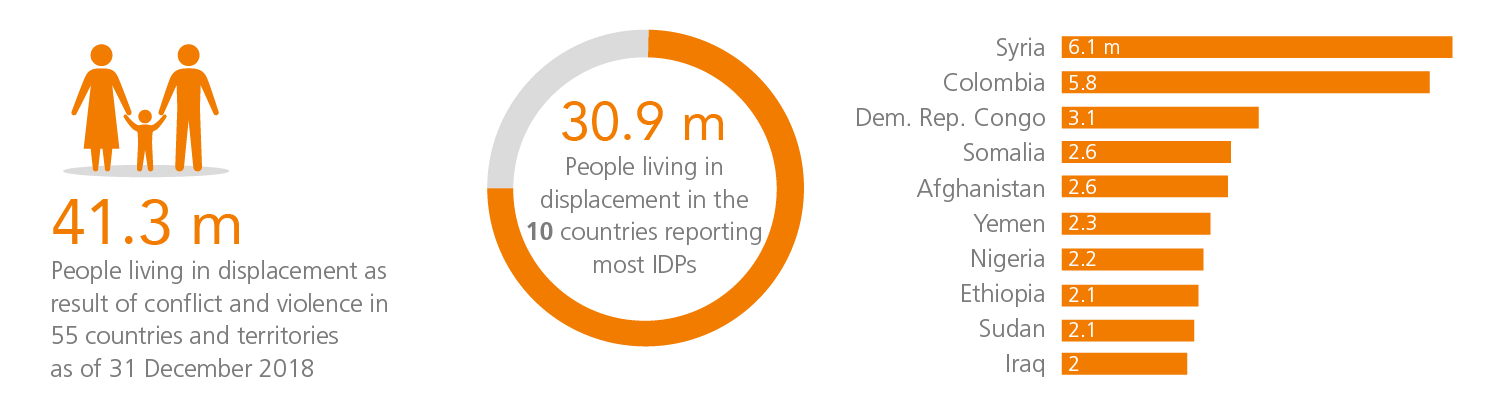 Despite refugees and international migrants making more media headlines, internally displaced people (IDPs) represent the majority of the world’s forcibly displaced. A new report published by the Internal Displacement Monitoring Centre (IDMC) reveals that the number of people displaced within their own countries by conflict and violence is the highest it has ever been: 41.3 million people, as of the end of 2018. This is an increase of more than a million since the end of 2017, and two-thirds more than the global number of refugees. Three-quarters, or 30.9 million people, were located in only 10 countries.