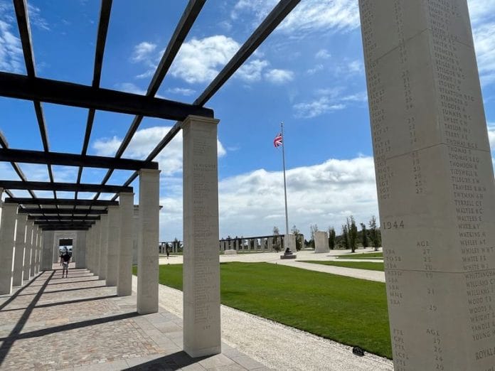 An elegant rectangular colonnade now sits on former farmland chosen by veterans themselves at Ver-sur-Mer.