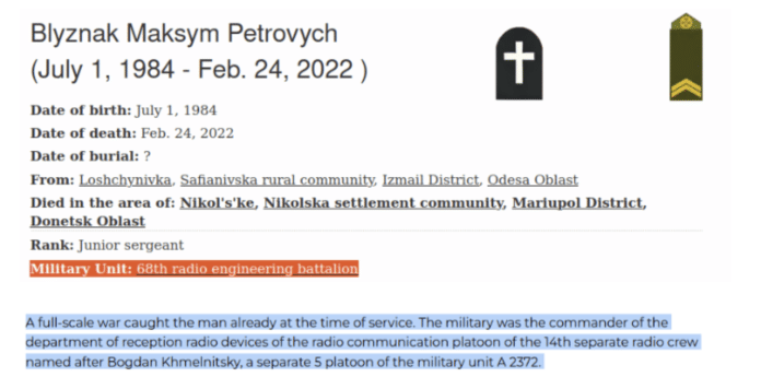 Although there is limited official documentation on the unit, information from websites and social media groups monitoring Ukrainian military personnel missing or killed in action suggests that it is the 68th Radio Engineering Battalion. This unit belongs to the 14th Separate Radio Technical Brigade named after Bohdan Khmelnytsky and is based in the Odesa region. Open-source records also suggest that this unit operates in coordination with Ukraine’s Marine Corps and has electronic warfare and reconnaissance capabilities.