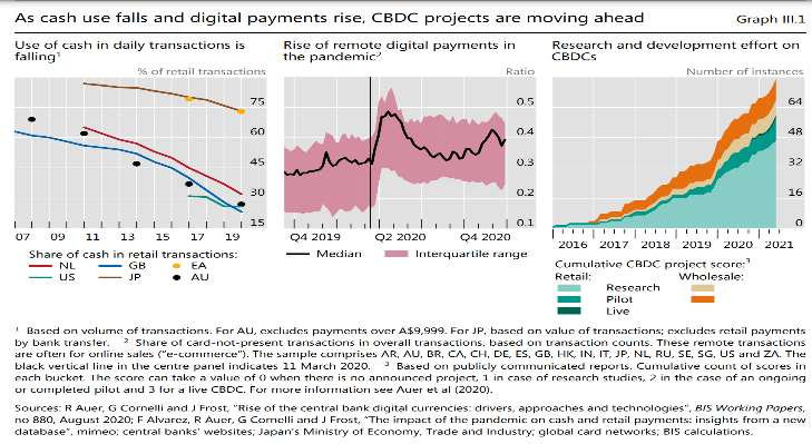 The possibility of bringing unbanked citizens under the umbrella of the country’s financial system (for direct transfers, subsidies etc.), having visibility (and control) into the citizens transactions and stopping private cryptocurrencies (e.g. Bitcoin) from becoming serious competition to the state’s monopoly over money – are the main reasons behind the popularity of CBDC’s. Then there are the immediate gains of real time 24×7 transfers and settlements and elimination of inefficiencies like float (ranges between 3 days to a week for international remittances), intermediary exchange fees (average of 3%) etc.