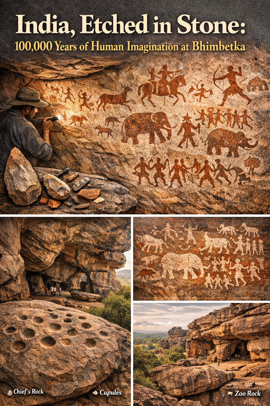 At the entrance stands the Chief’s Rock, bearing mysterious cup-shaped depressions known as cupules, carved nearly 100,000 years ago. These are the world’s oldest known rock engravings, older than writing, older than farming, older than civilization itself.