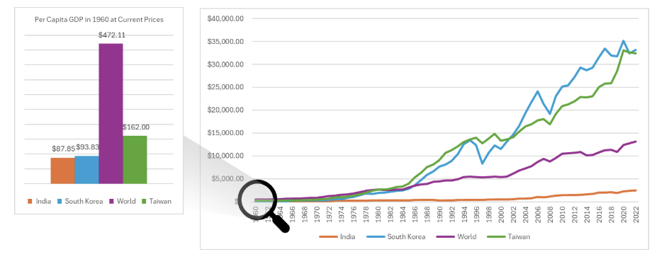 Per capita GDP is the most comprehensive metric to determine the progress of a nation and its people. It is the only indicator that correlates with human development indicators, social indicators and poverty alleviation. Figure 1 below illustrates the per capita GDP trend between 1960 and 2023 for India, South Korea, Taiwan and the World average, along with a callout to the per capita GDP for the respective entities in 1960.